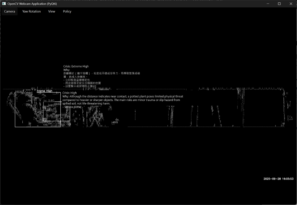 Having set up the object detection pipeline, I proceeded to the image processing stage, where the raw visual data and the model’s outputs are transformed into a more artistic representation. My process involved several key steps. First, I applied edge detection algorithms to the video frames. This technique identifies points in a digital image where the brightness changes sharply, effectively outlining the shapes and contours of objects in the scene. Next, I inverted the black and white colour, creating a stark, high-contrast visual style. Finally, I took the bounding boxes generated by the YOLO detection model and redrew them onto this processed image. This layering of machine perception over a stylised version of reality creates a compelling visual dialogue between the actual scene and the AI’s interpretation of it.